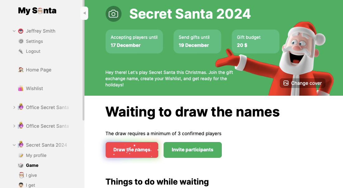 The easiest way to organize the game is with the MySanta app. It provides an intuitive interface, easy and fast participation for everyone, and a variety of additional features to spice up the game. These include creating wishlists, tracking who is giving to whom, sending reminders to forgetful Santas, and communicating with gift recipients.