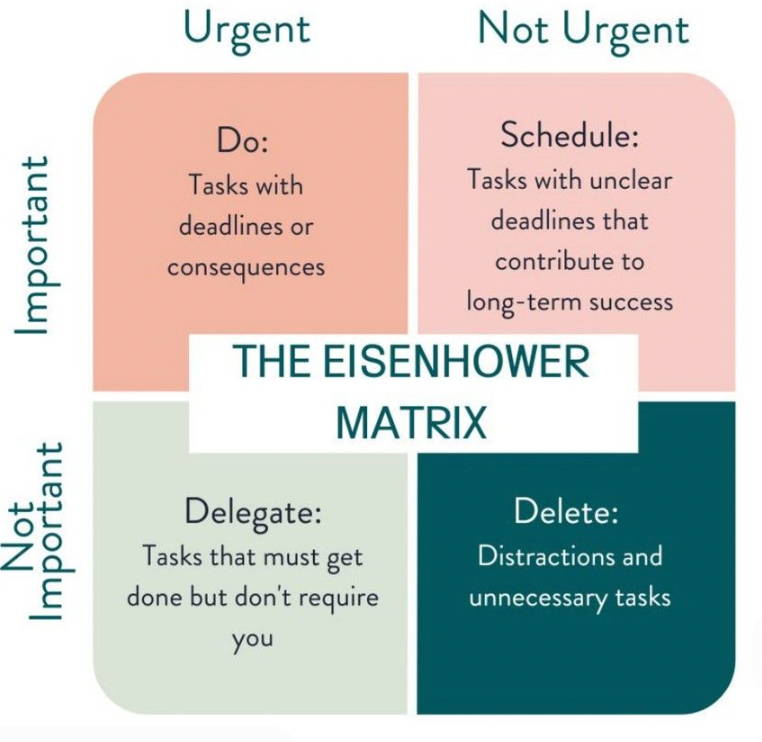 Once your list is ready, it’s time to separate what’s urgent from what’s secondary. The Eisenhower Matrix is the perfect tool for this.